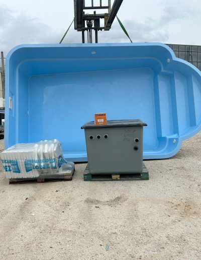 Piscina color azul, caseta depuradora enterrada, foco led blanco, cuadro eléctrico, piedra de coronación y lona invernal